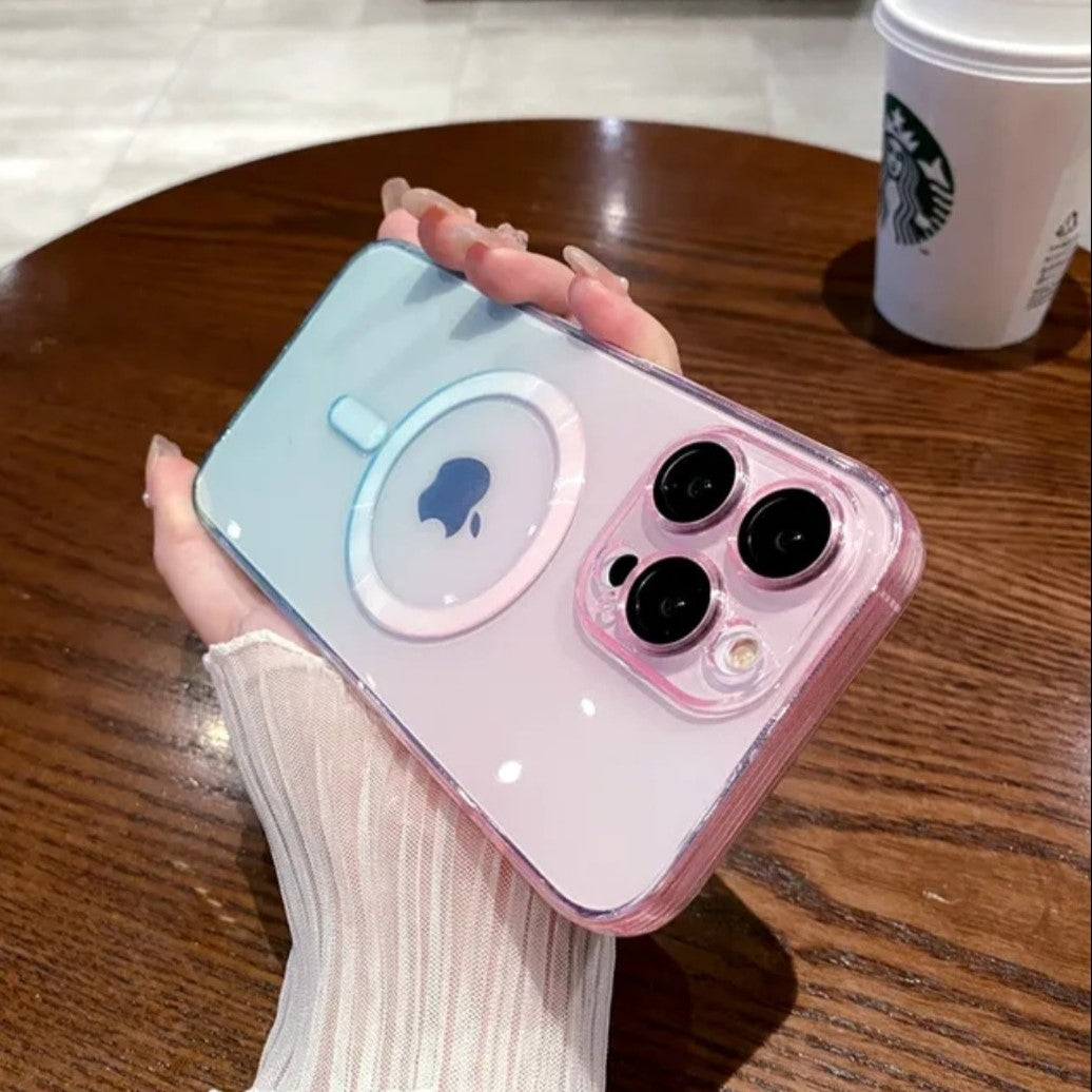 This dual color iPhone 15 ProMax case offers both style and functionality. The multi color clear design allows your phone's original color to shine through while providing shockproof protection. The case is also magnet safe and includes camera lens protection for added convenience.